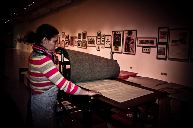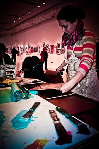 Mientras tenía lugar la presentación de la Compañía Cachiporra, en la sala de artes visuales comenzaba la actividad realizada por los miembros del Centro de Grabado de Valparaíso, consistente en la demostración de impresión de grabado, en el centro de la sala que alberga la exposición Grabado Manifiesto. Actividad de Mediación destinada a difundir la práctica de grabado, montando para ello una prensa y disponiendo turnos de artistas para asegurar diariamente –de 14 a 18 hrs- la exhibición de su uso.