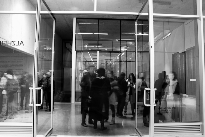 Algunos pensaban que el corte de luz de la tarde había dejado con baja intensidad la iluminación de la sala, sí, habíamos estado casi todo el día sin energía debido a un corte programado por la compañía que nunca se nos avisó. Todo se retrasó un poco y las pruebas técnicas se hicieron rápidamente, pasadas las 19 horas abríamos las puertas de la exposición Alzheimer, la que está caracterizada con una tenue luz.