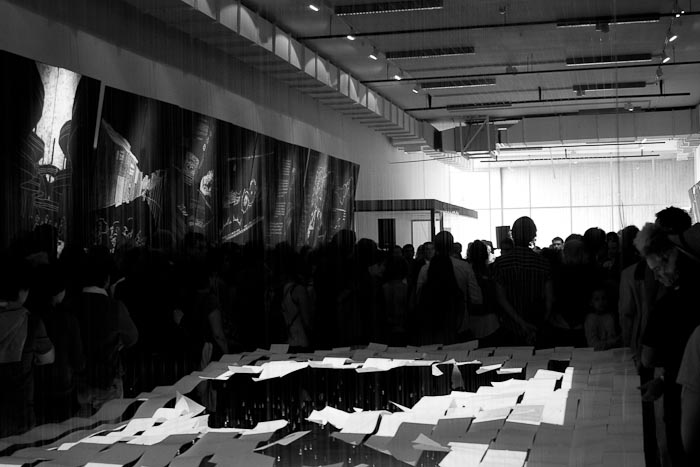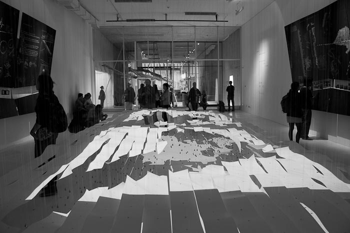 Asimismo, existen tres grandes láminas de papel que cuelgan de 2500 hilos de nylon y que conforman tres mantos cartográficos suspendidos en medio de la sala, en el que se proyectarán las obras, actos y proyectos que la Escuela ha desplegado en la extensión americana durante estos 60 años.