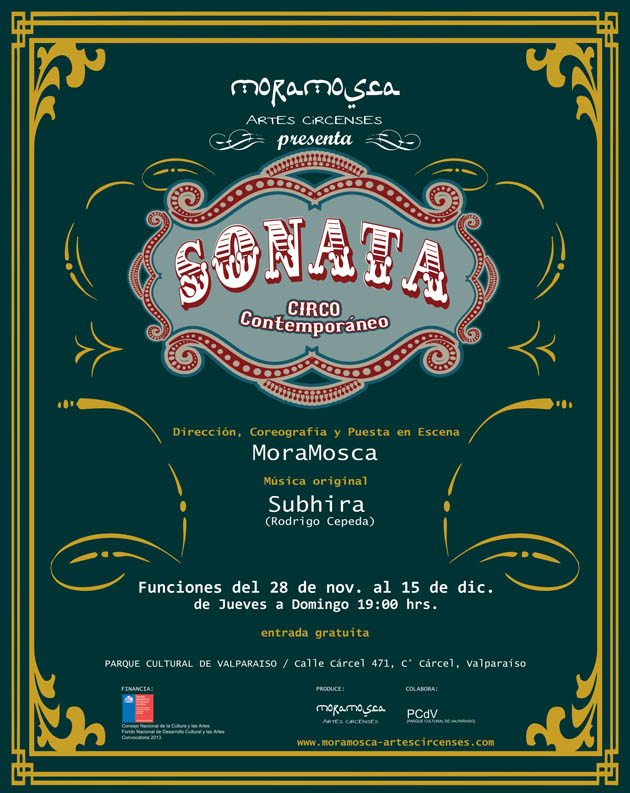 La obra ocurre sobre una estructura que asimila una carpa de circo pero sin la lona, con una altura cercana a ocho metros, los artistas despliegan una serie de efectos y acrobacias a gran altura. Desde el 28 de Noviembre al 14 de diciembre se presentará SONATA, espectáculo a cargo de la compañía Mora-Mosca se presentará de manera gratuita en el Parque Cultural de Valparaíso.