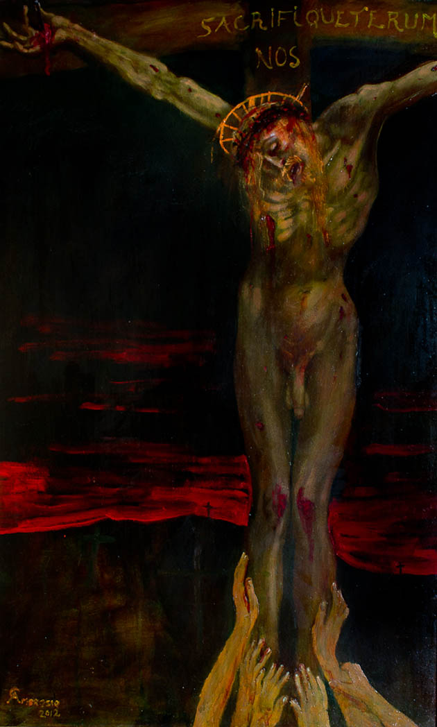 A vuestra izquierda encontrarán las pinturas de Camilo Ambrosio. Lo primero que hay que hacer es conectar estas pinturas con dos grandes artistas de la pintura universal: Grunewald y Holbein. Entonces, hay que buscar las dos referencias. Grunewald es autor de una famosa Crucifixión, en 1516, como parte del Retablo de Issenheim. Holbein, por su parte, es autor de Cristo muerto en la tumba (1521).