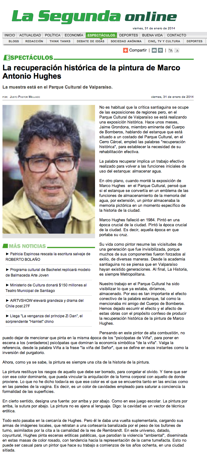 El pasado jueves 30 de enero se realizó un Conversatorio en torno a la obra y figura del pintor porteño Marco Antonio Hughes, fallecido tempranamente en 1984 y del cual poco se conocía transformándose en un mito o una leyenda, pues muchos sabían de su existencia, pero pocos conocían su obra.
