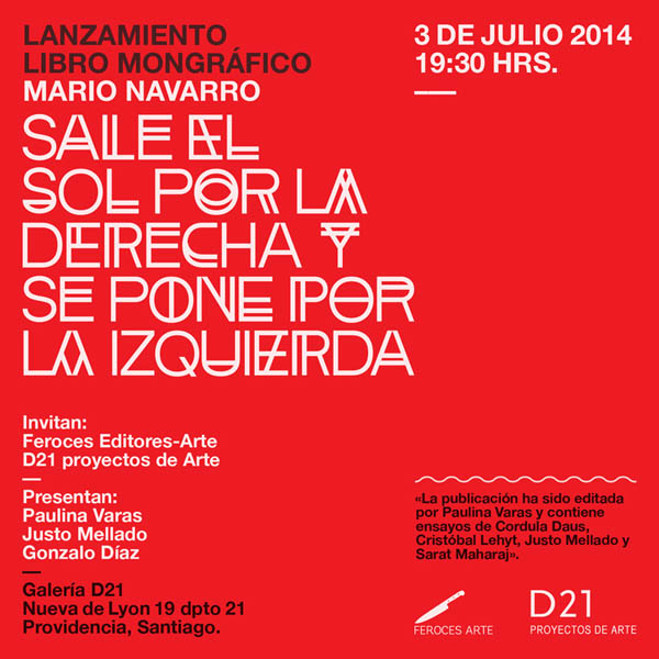 Este jueves 3 de julio a las 19:30 horas se lanzará el libro de Mario Navarro “Sale el sol por la derecha y se pone por la izquierda” en la Galería D21 ubicada en Ñuñoa. La publicación a sido editada por Paulina Varas y contiene ensayos de Cordula Daus, Cristóbal…