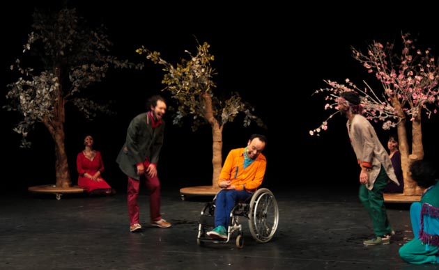 MP: De hecho así partimos, nosotros siempre hacemos teatro de calle porque nos gusta intervenir la ciudad finalmente, estar donde está la gente, poder oficiar el rito ciudadano, generar encuentro, que la gente se encuentre entre sí a propósito de que está recibiendo, dialogando, emocionándose, pensando, sentimos que eso es muy importante en Chile, la gente no va al teatro en general y en realidad es un momento en que hay que ir a la gente, hay que estar con la gente, hay que escuchar a la gente además, y uno como actor, como creador siempre dialoga con el público, todas las funciones son distintas, las hace mucho el público; pero tenemos siempre esa flexibilidad, de ir adaptándonos, si aquí en Valparaíso está este espacio, bueno se adapta la obra a este espacio, pero si fuera en la calle lo hacemos aunque en invierno es muy complicado estar en la calle por el frío, vamos donde está la gente.