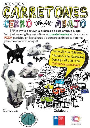 Durante todo el día el Kolectivo de Pedagogía Patrimonial, KPP, está invitando a toda la comunidad a una entretenida jornada de construcción de carretones con la finalidad de revivir ese clásico juego de antaño y culminar tirándose cerro abajo. Sólo se solicita que las personas interesadas lleguen con los rodamientos para poder armar su carretón. Para lanzarse cerro abajo se ruega traer casco, rodilleras y coderas.