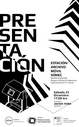 El proyecto SÓNEC fue creado en 2014 en Valparaíso transformándose en la primera sonoteca online de música experimental y arte sonoro del país con más de 500 archivos disponibles en http://www.sonecarchivo.org/. En esta ocasión, abren al público la posibilidad de interactuar directamente con archivos de audio diseñados, recopilados, clasificados y catalogados por ellos, a través de una instalación móvil que estará ubicada en la explanada y mirador del Parque Cultural de Valparaíso. La actividad se realizará el sábado 23 de diciembre y comenzará a las 17:00 horas.