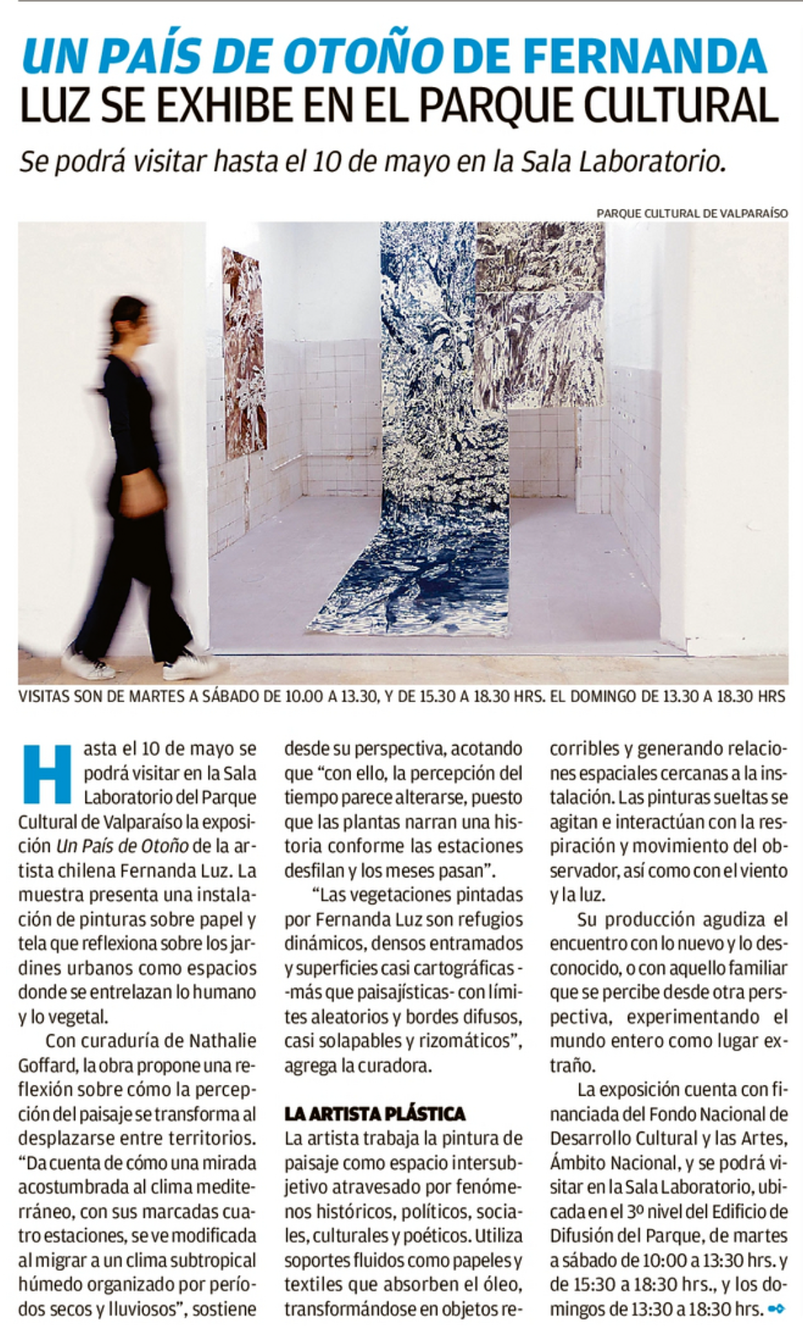 La artista chilena Fernanda Luz inaugurará este sábado 18 de abril, a las 12:00 hrs. la exposición ‘Un país sin otoño’ en la Sala Laboratorio del Parque Cultural de Valparaíso – Ex Cárcel (PCdV – Ex Cárcel). La muestra presenta una instalación de pinturas sobre papel y tela que reflexiona sobre los jardines urbanos como espacios donde se entrelazan lo humano y lo vegetal.
