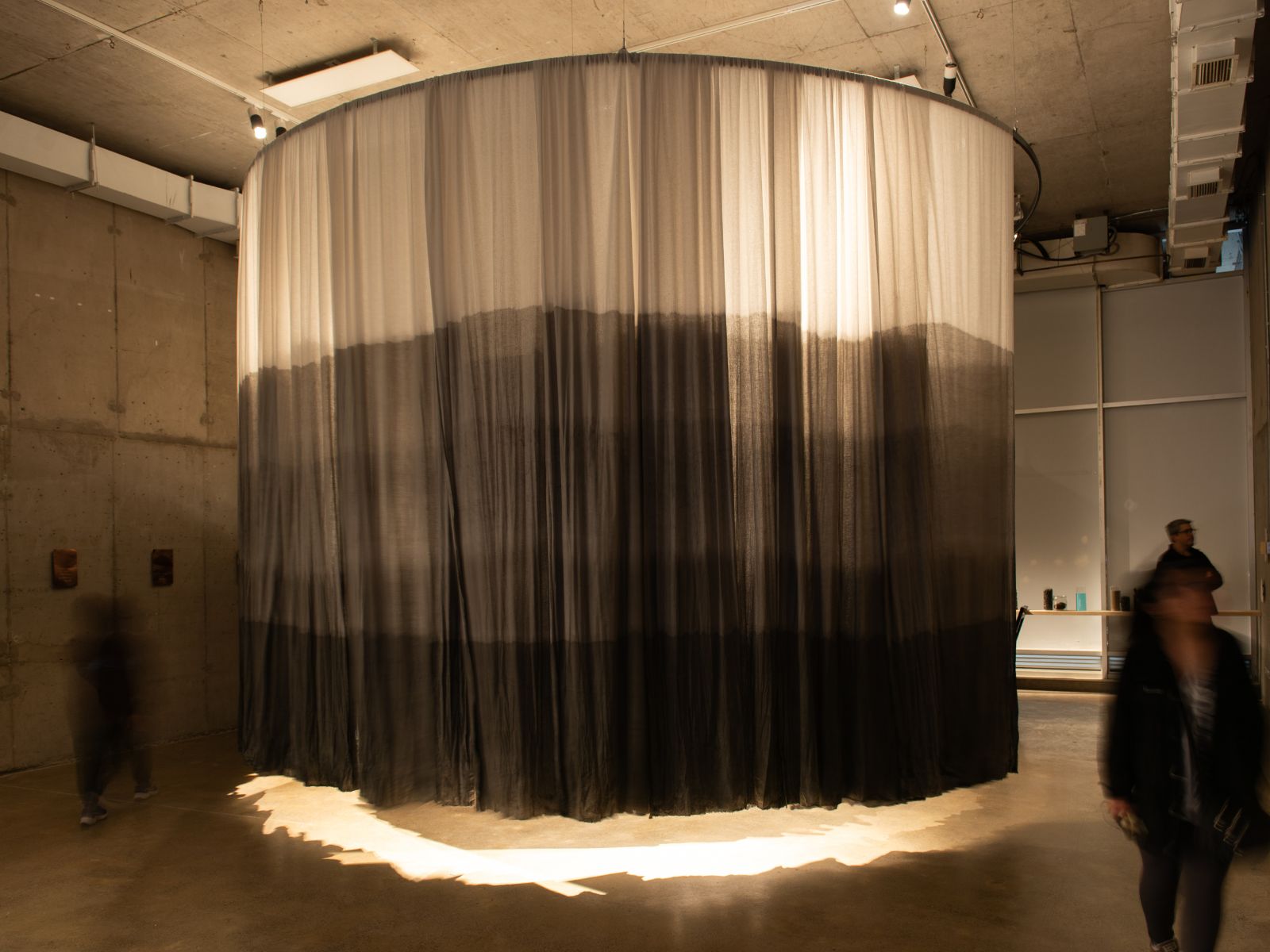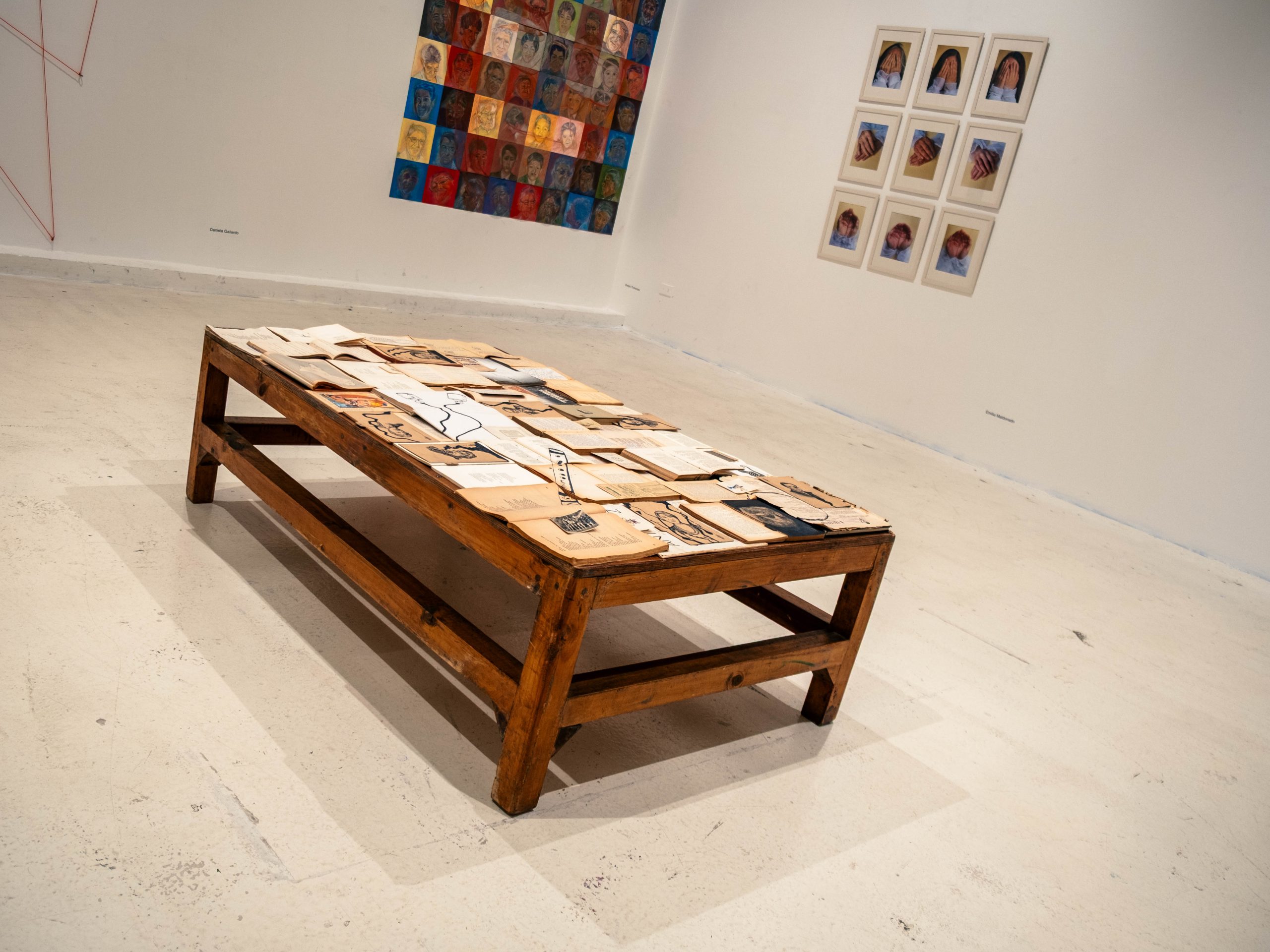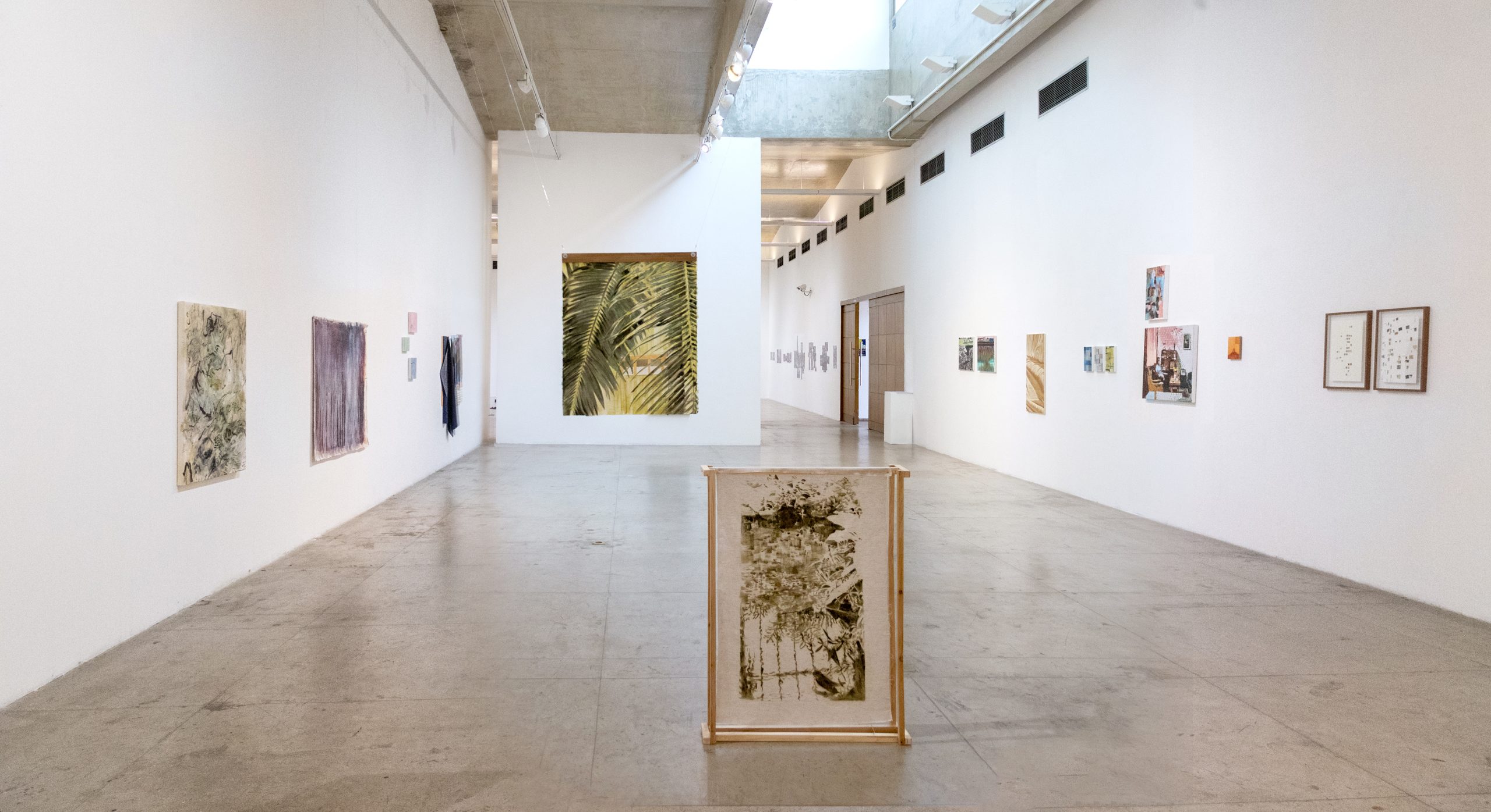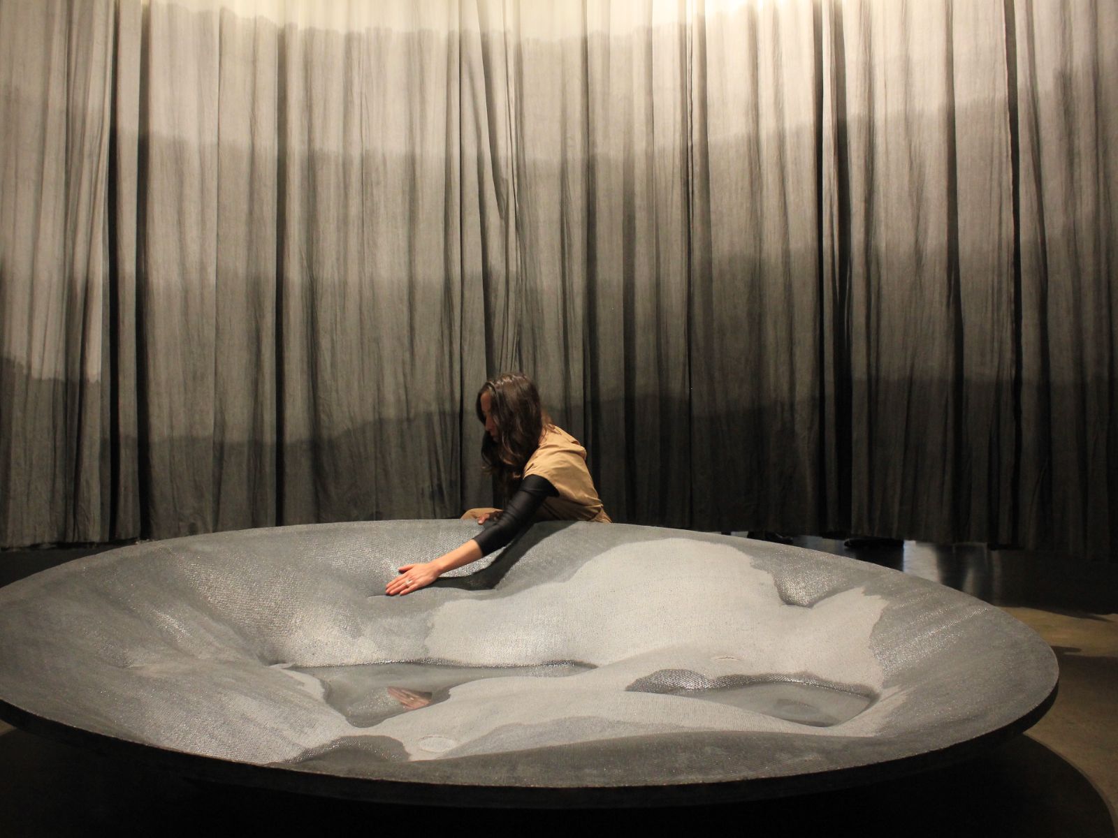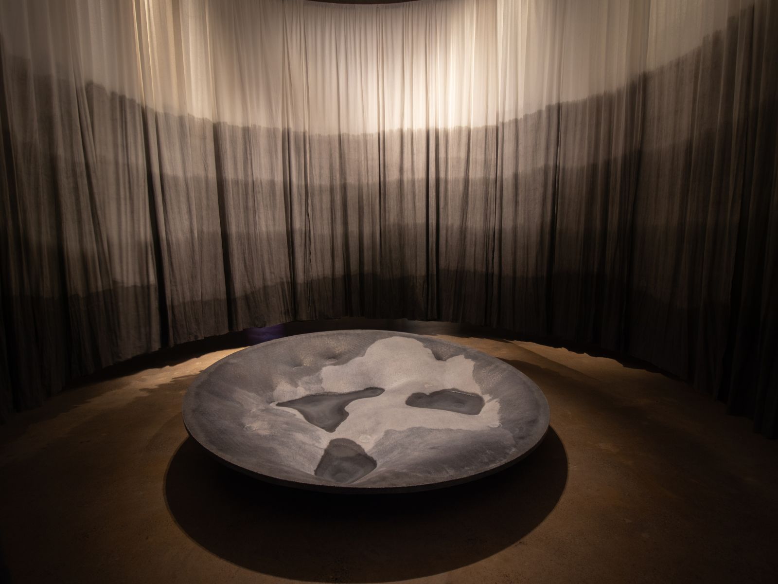 Concebida como un recorrido inmersivo, la instalación reúne piezas de hormigón, textiles teñidos y poemas inscritos en cobre junto con una muestra de los materiales empleados en el proceso. Los elementos organizan el espacio haciendo visible la relación entre experimentación material y reflexión territorial. Lo que permite reconocer componentes, transformaciones y vínculos, estableciendo un diálogo entre materia, estructura y escritura.