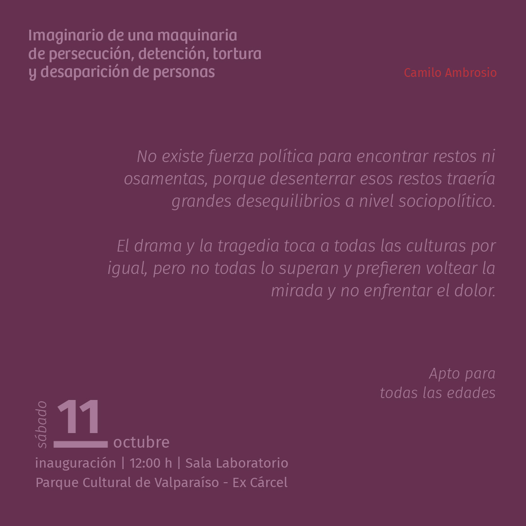 La exposición “Imaginario de una maquinaria de persecución, detención, tortura y desaparición de personas” de Camilo Ambrosio es un extenso recorrido en su obra que da cuenta de sus reflexiones sobre los regímenes dictatoriales y los crímenes de lesa humanidad que sufrieron diversos países de Latinoamérica, en especial Chile y Argentina. Lo que se tradujo en persecución política y en consecuencia de personas que aún se encuentran detenidas desaparecidas.