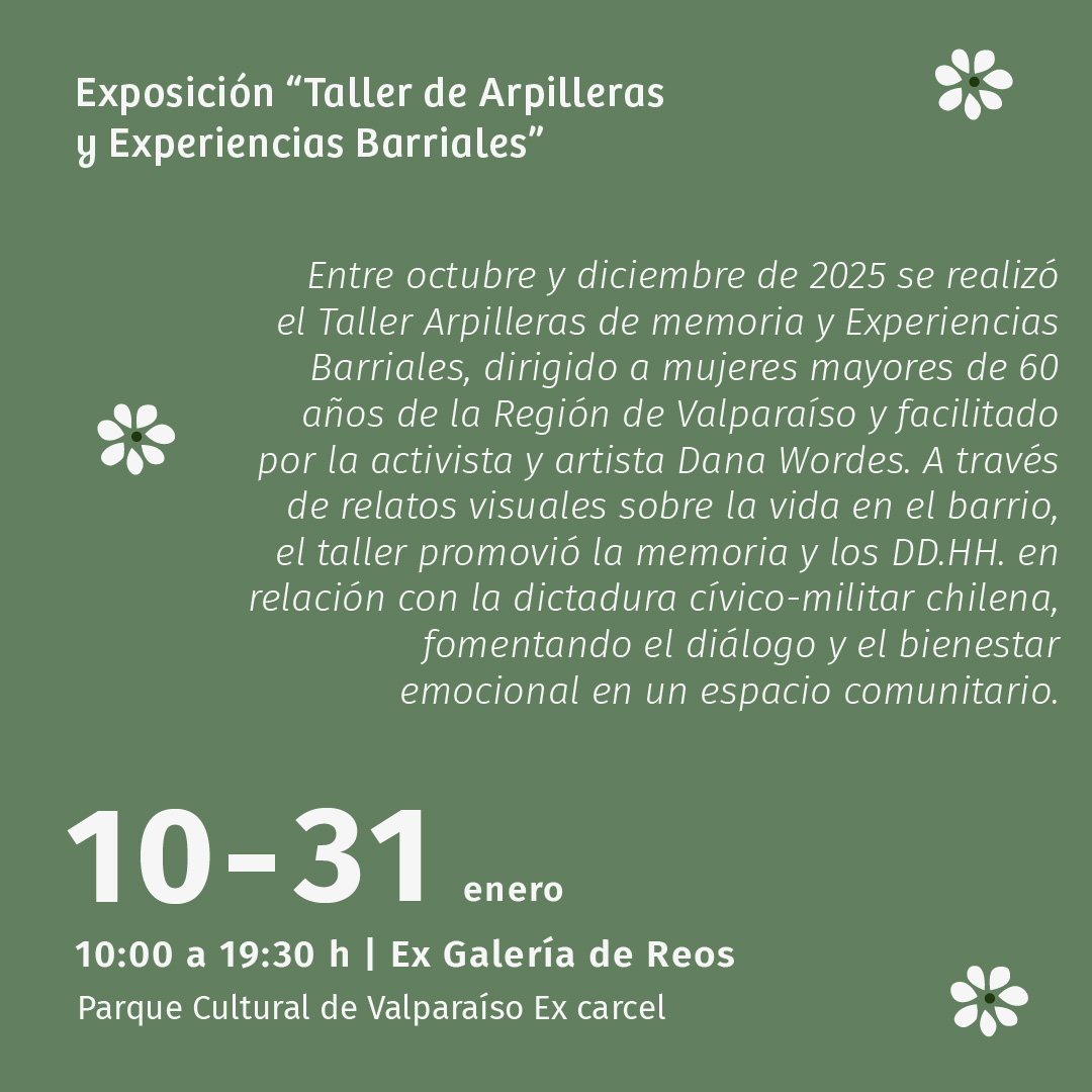 Entre los meses de octubre y diciembre de 2025 se desarrolló el Taller ‘Arpilleras de memoria y Experiencias Barriales’ en la Sala de Lectura del  Sitio de Memorias Parque Cultural de Valparaíso – Ex Cárcel, dirigido a mujeres mayores de 60 años de distintas localidades de la Región de Valparaíso y facilitado por la activista política y artista Dana Wordes.