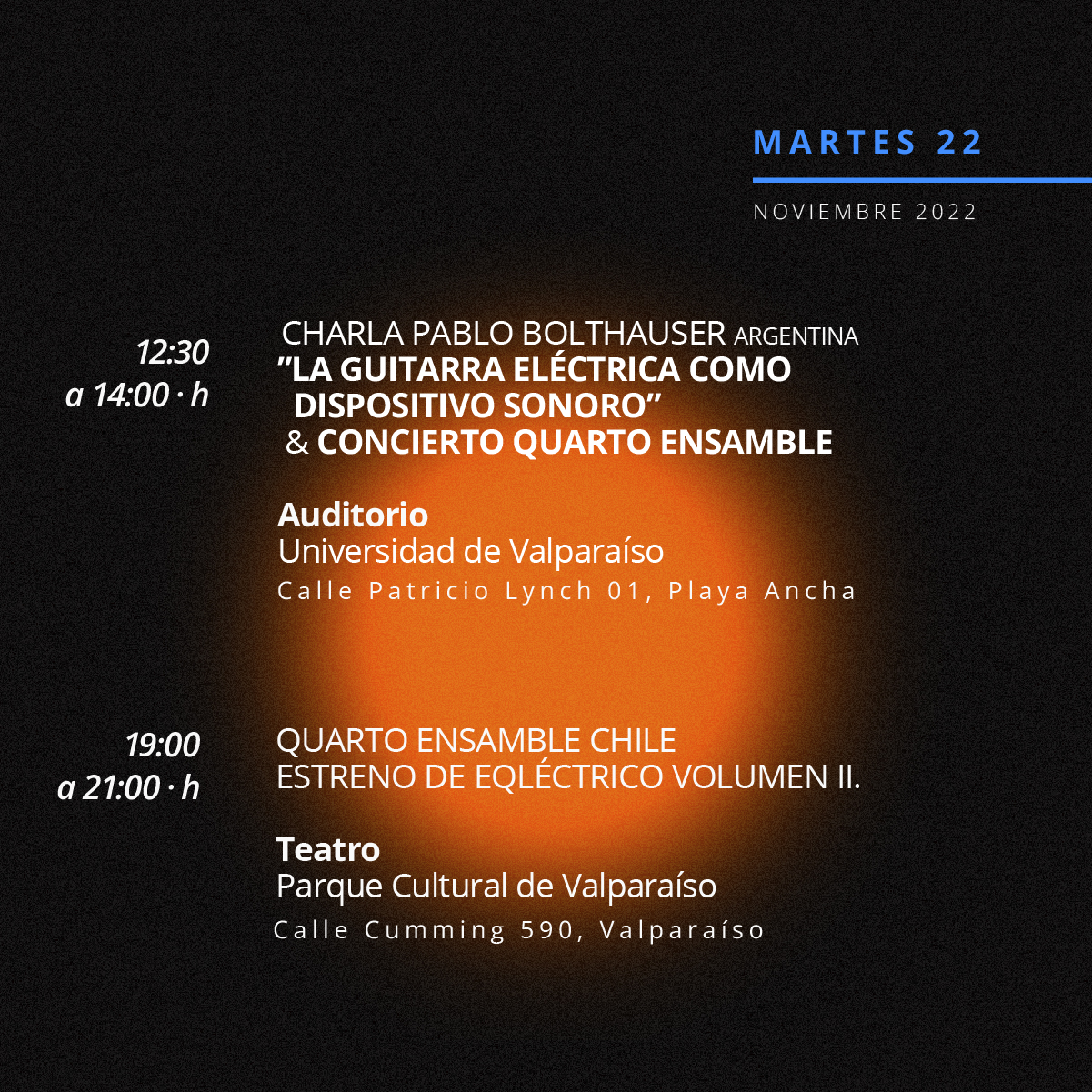 El primer Festival Internacional de la Guitarra Eléctrica Contemporánea busca ampliar los horizontes de la guitarra eléctrica y su multiplicidad de posibilidades tímbricas, por medio de charlas y conciertos de obras para solistas, dúos, cuartetos y orquestas. Al mismo tiempo quiere visibilizar el trabajo musical en torno a la guitarra contemporánea desarrollado en Valparaíso y otras latitudes del mundo.
