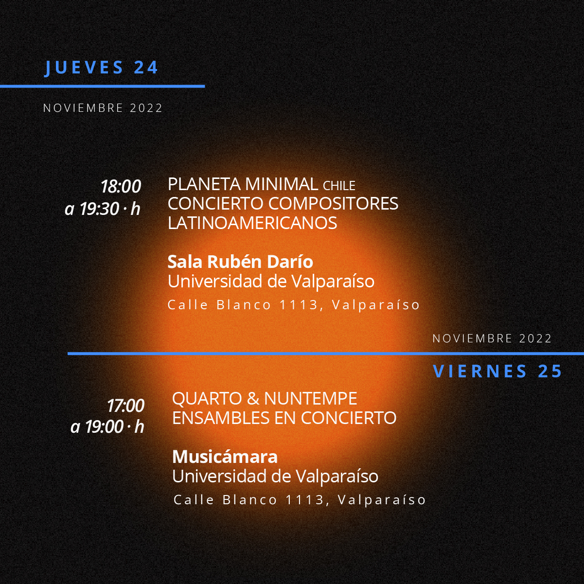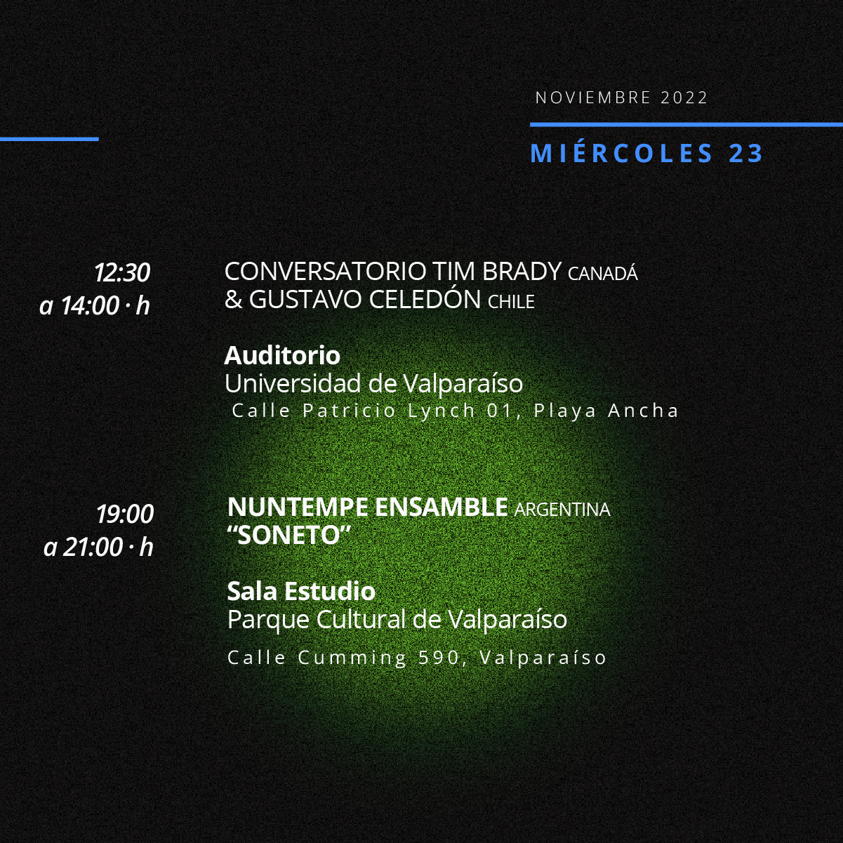 Los artistas que darán vida a este festival son Quarto Ensamble y Planeta Minimal, de Chile; Nuntempe Ensamble, de Argentina; y Tim Brady, de Canadá. Estas cuatro agrupaciones estrenarán obras de compositores contemporáneos tales como el argentino Marcos Franciosi, el japonés Hiroki Tsurumoto, el chileno Paul Hernández, el estadounidense Jeremey Poparad y el canadiense Kevin O’Neal, entre otros. Asimismo, también se interpretarán por primera vez en guitarra eléctrica obras del eximio compositor argentino Alberto Ginastera (1916-1983).