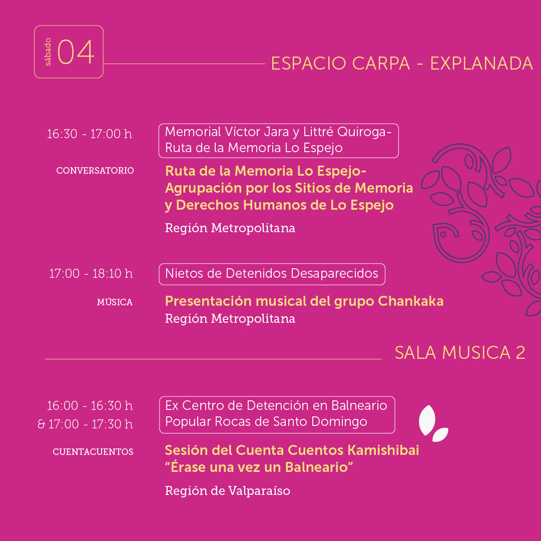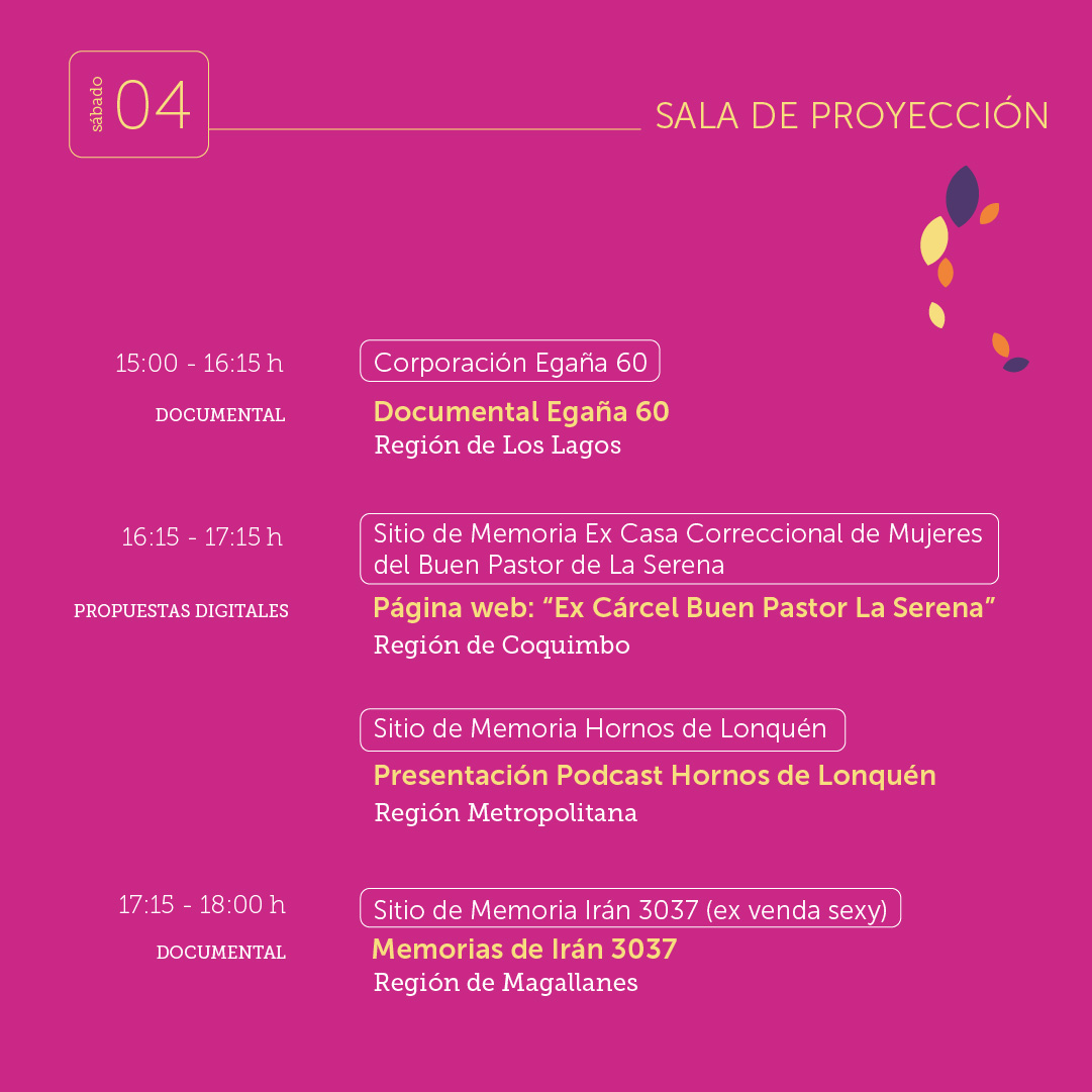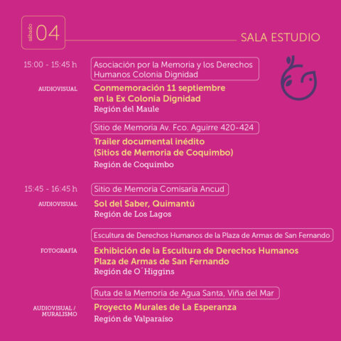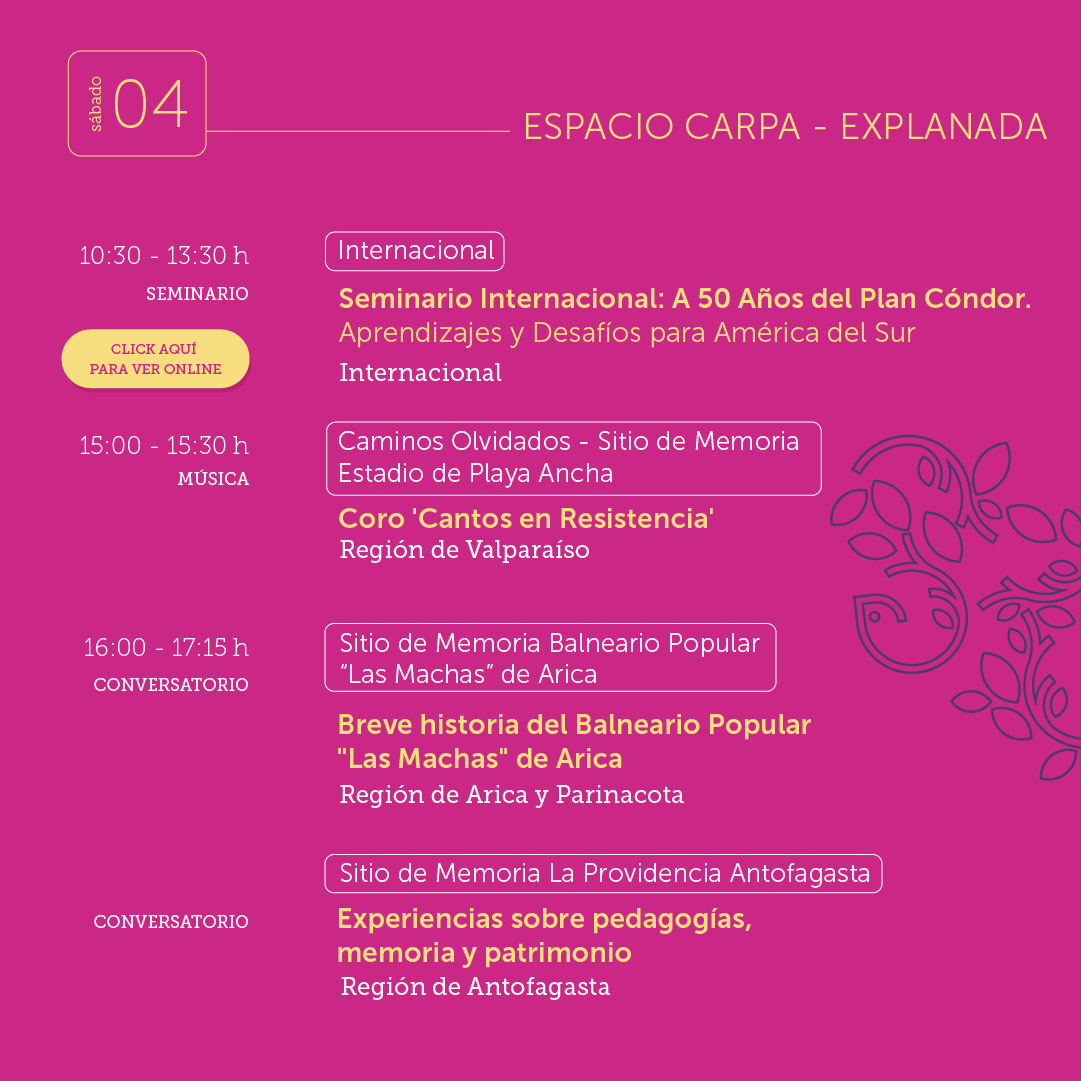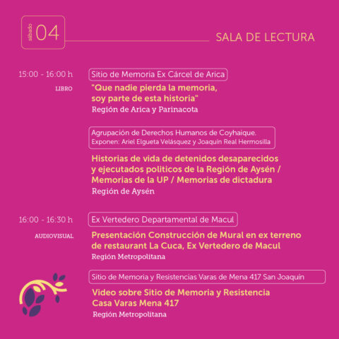 Este viernes 3 y sábado 4 de octubre organizaciones de derechos humanos que gestionan sitios de memorias de todo el país se reunirán en el IV Encuentro Nacional de Sitios de Memorias “Las de las Memorias por el derecho de Vivir en Paz” evento organizado conjuntamente por la Unidad de Cultura, Memoria y Derechos Humanos de la Subsecretaría de las Culturas y las Artes del Ministerio de las Culturas, las Artes y el Patrimonio y el Parque Cultural de Valparaíso – Ex Cárcel, declarado Sitio de Memoria por el Estado de Chile el año 2019. Además cuenta con la colaboración del Proyecto Colectivo Plan Cóndor.
