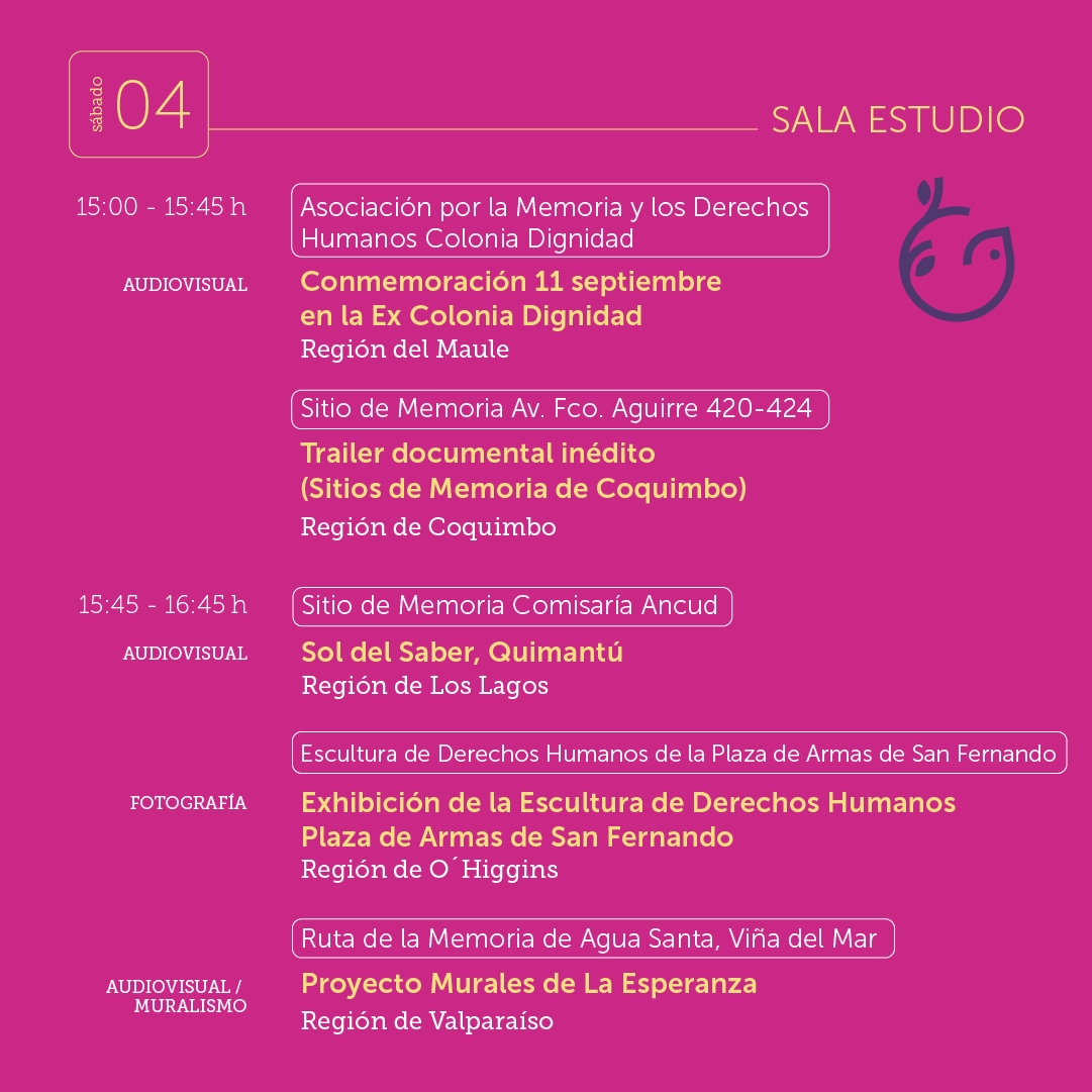 Esta cuarta edición, que por vez primera se desarrollará fuera de la Región Metropolitana, busca promover y visibilizar las producciones culturales generadas por agrupaciones de derechos humanos distribuidas a lo largo del país en el periodo 2015-2025. Con el foco puesto en la difusión y el intercambio, la reflexión y evaluación de las políticas públicas en torno al rescate de la memoria histórica de las violaciones de derechos humanos.