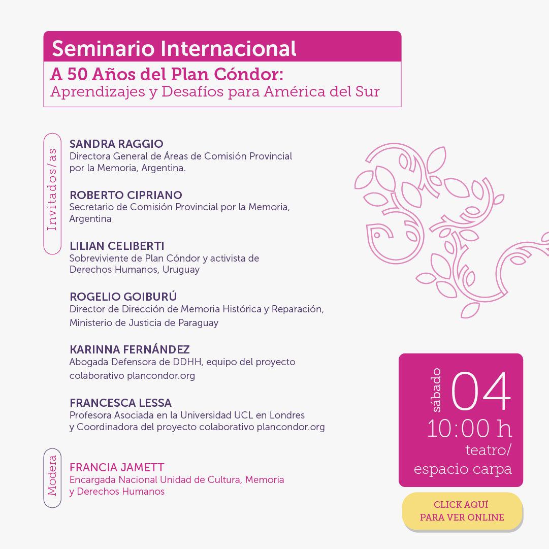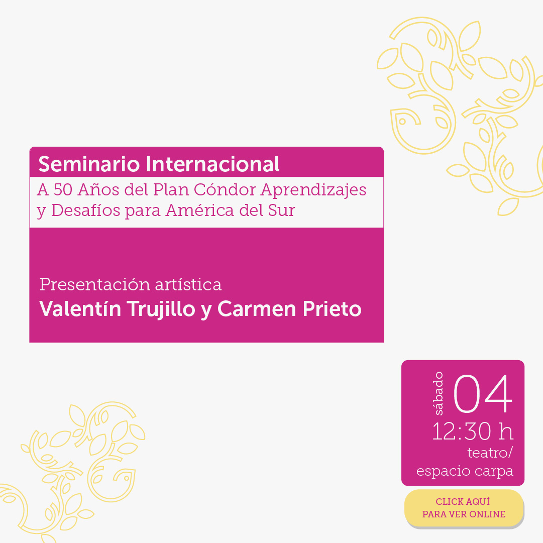 La transmisión de vía streaming del Seminario Internacional a 50 años del Plan Cóndor: Aprendizajes y Desafíos para América del Sur + la presentación de Valentín Trujillo y Carmen Prieto la puedes seguir en el siguiente link: https://www.youtube.com/@MinisteriodelasCulturas/streams
