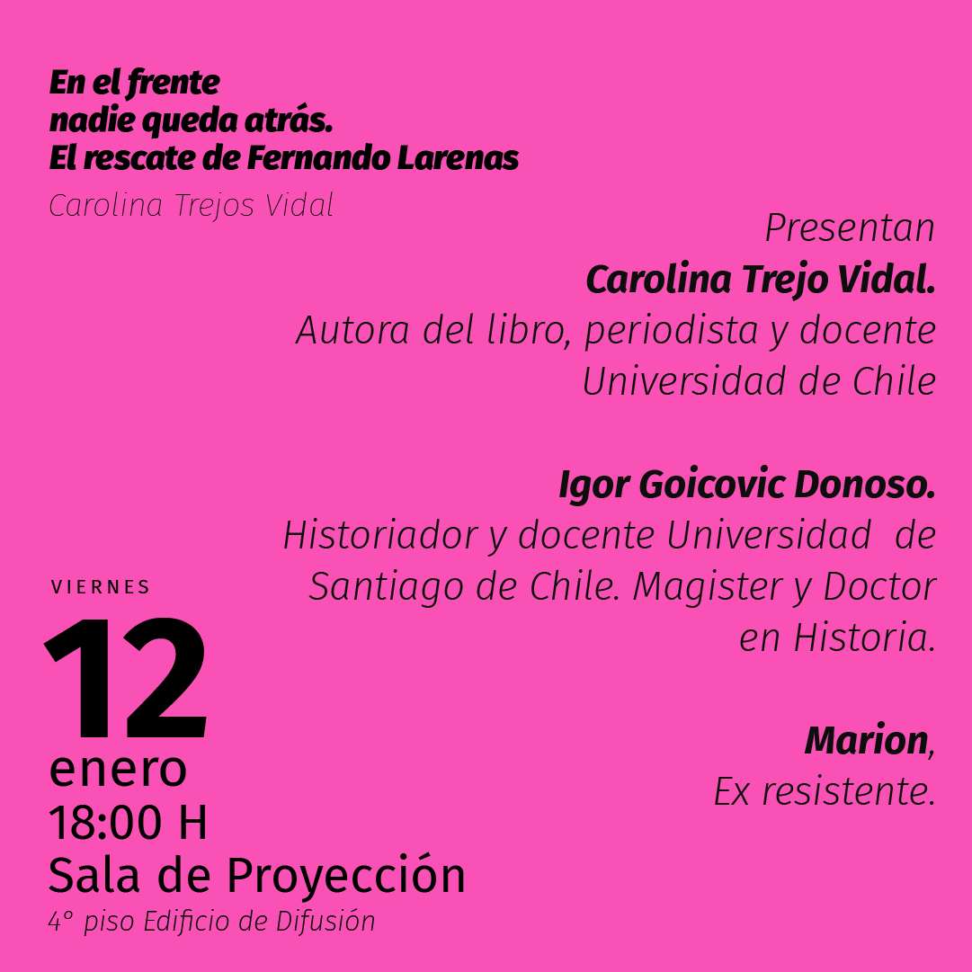 La presentación del libro “En el Frente nadie queda atrás. El rescate de Fernando Larenas” se llevará a cabo, de manera gratuita, el viernes 12 de enero a las 18:00 hrs. en la Sala de Proyección del Parque Cultural de Valparaíso – Ex Cárcel.