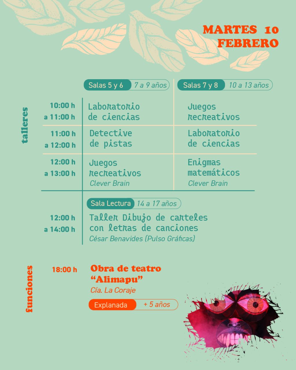 Taller de dibujo de carteles con letras de canciones: en este taller trabajaremos con la música y las artes gráficas, representando frases de canciones a través de carteles con letras dibujadas a mano. Quienes participen aprenderán nociones básicas de cómo elaborar un póster de lettering desde cero y experimentarán distintas maneras de crear letras de fantasías para plasmar las diversas frases que escojan. Trabajaremos con marcadores y pintura acrílica sobre papel.