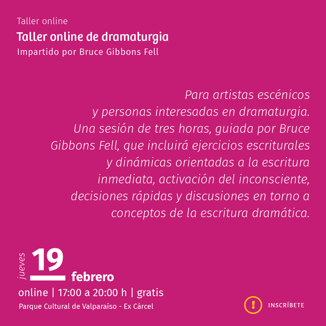 Una sesión de tres horas, guiada por Bruce Gibbons Fell, que incluirá ejercicios escriturales y dinámicas orientadas a la escritura inmediata, activación del inconsciente, decisiones rápidas y discusiones en torno a conceptos de la escritura dramática