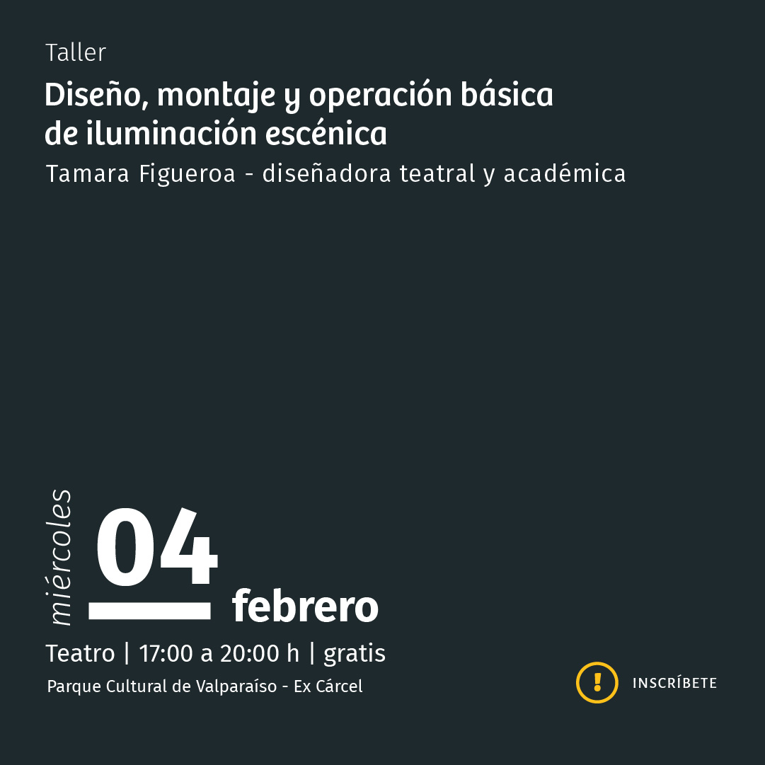El taller “Diseño, montaje y operación básica de iluminación escénica” se impartirá el miércoles 4 de febrero a las 17:00 hrs. en el Teatro del Parquie Cultural de Valparaíso – Ex Cárcel. Participación previa inscripción.