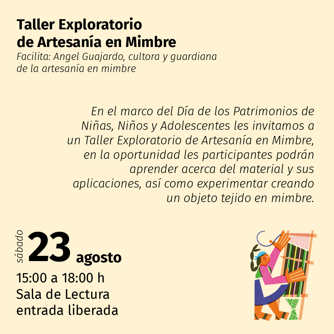 En el marco del Día de los Patrimonios de Niñas, Niños y Adolescentes 2025 les invitamos a un Taller Exploratorio de Artesanía en Mimbre, en la oportunidad les participantes podrán aprender acerca del material y sus aplicaciones, así como experimentar creando un objeto tejido en mimbre.