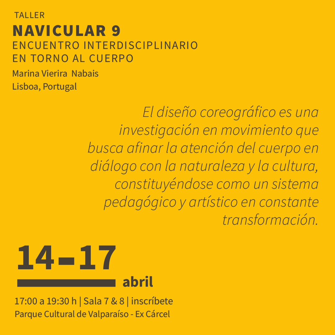 NAVICULAR 9 es un encuentro interdisciplinario en torno al cuerpo, donde Marina Vieira Nabais, artista escénica nacida en Luanda, vivirá un proceso de residencia artística a través del Taller-Laboratorio Diseño Coreográfico, donde pone a disposición su investigación doctoral hecha práctica colectiva.
